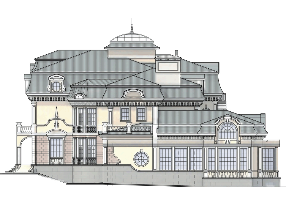 Тип фундамента - монолитная плита Материал наружных стен - кирпич с утеплителем Перекрытия - сборные Крыша - мансардная Покрытие кровли - мягкая или металлочерепица Наружная отделка стен - штукатурка Цоколя - натуральный (искусственный) камень