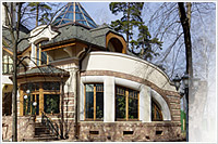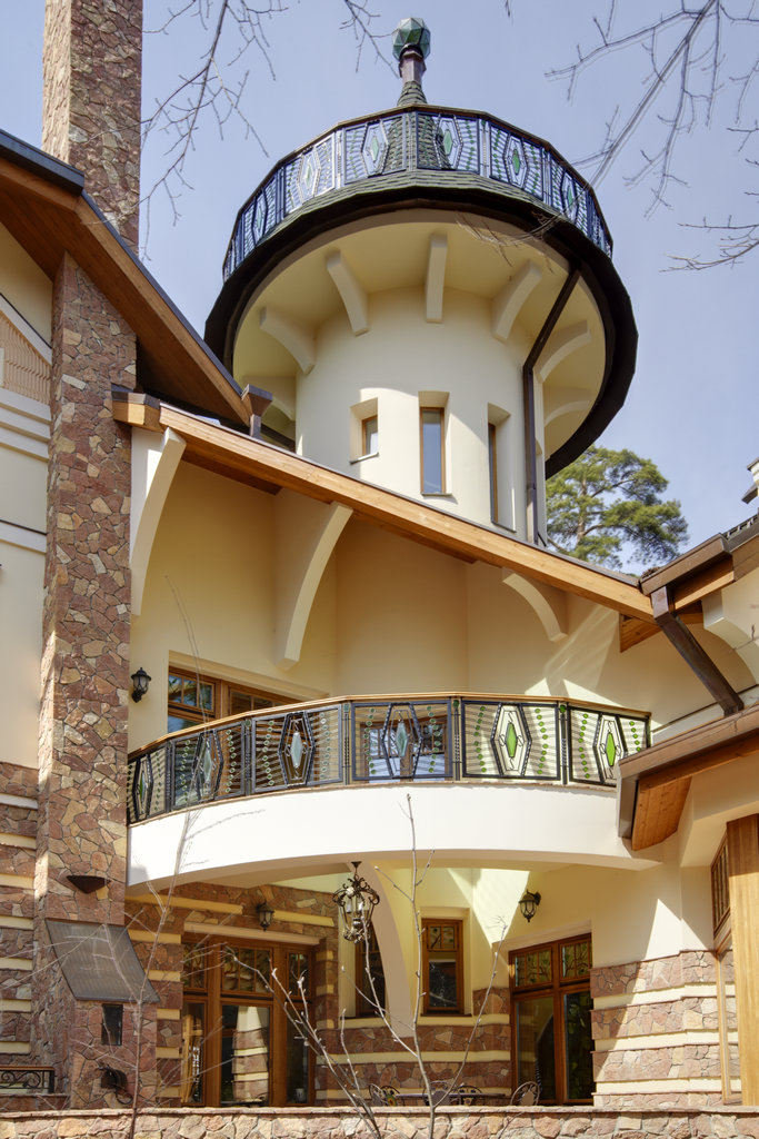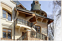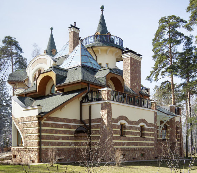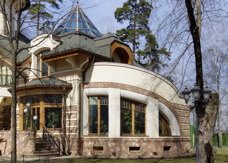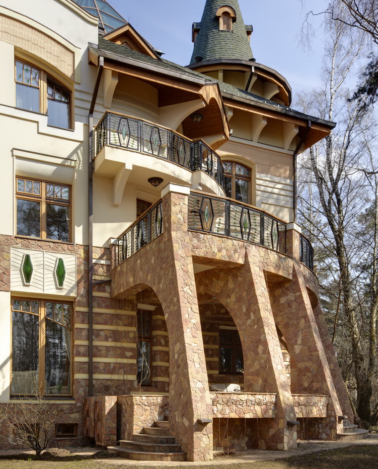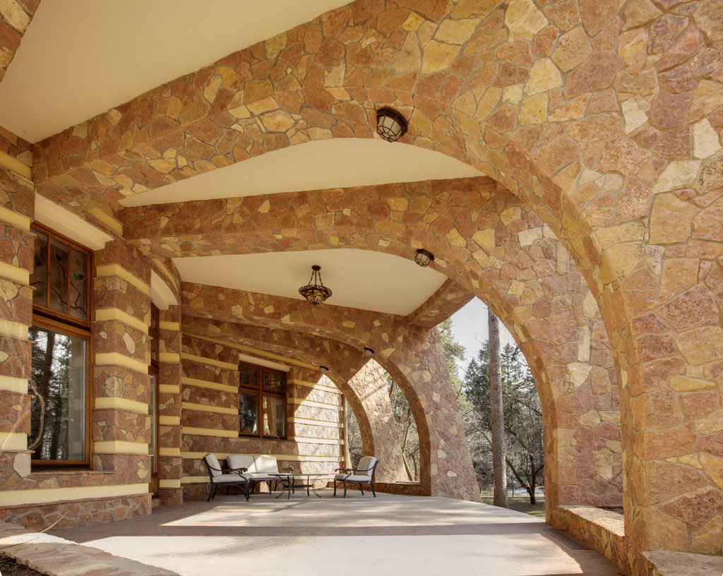 6. Фасады -цоколь- облицовка природным камнем, Cтены - 1 этаж - облицовка природным камнем, детали - штукатурка белого цвета, 2 этаж - штукатурка.