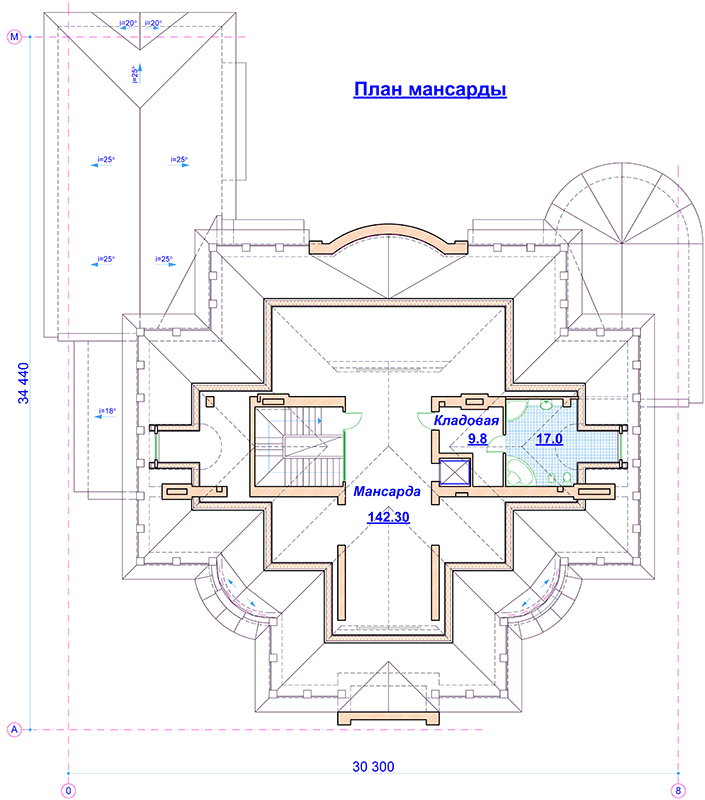 Кровля -- скатная, мансардная (утеплённая), с деревянными стропилами по металлическим балкам