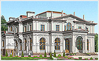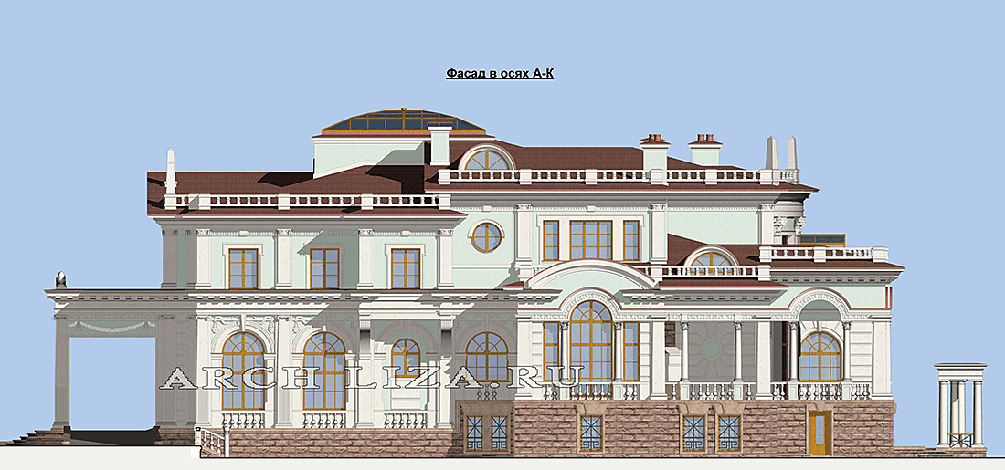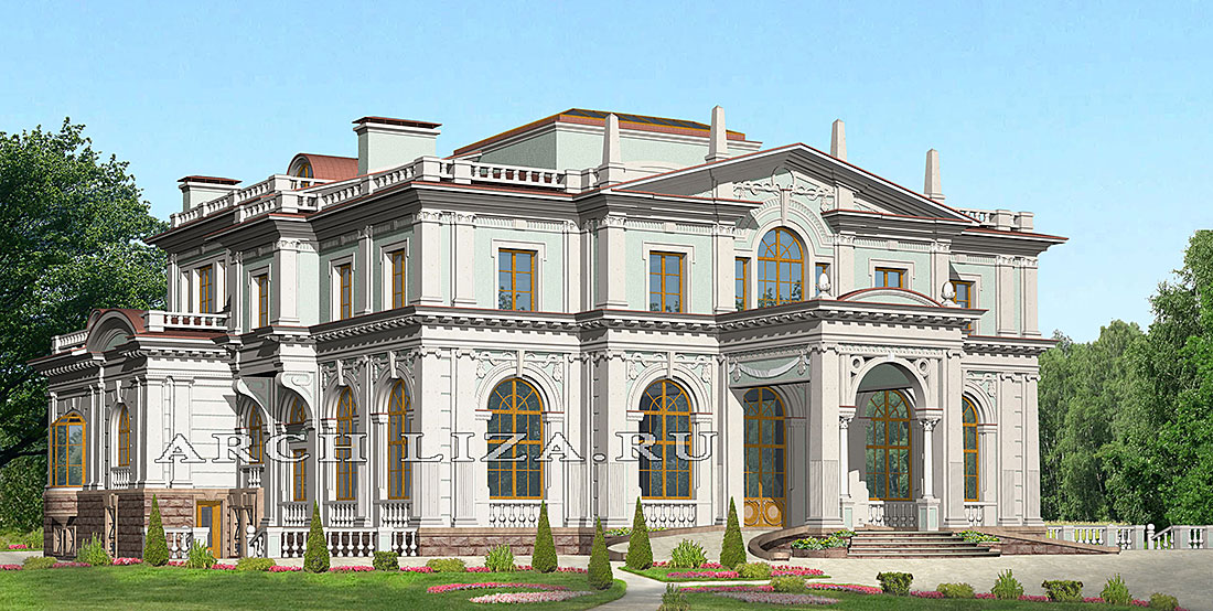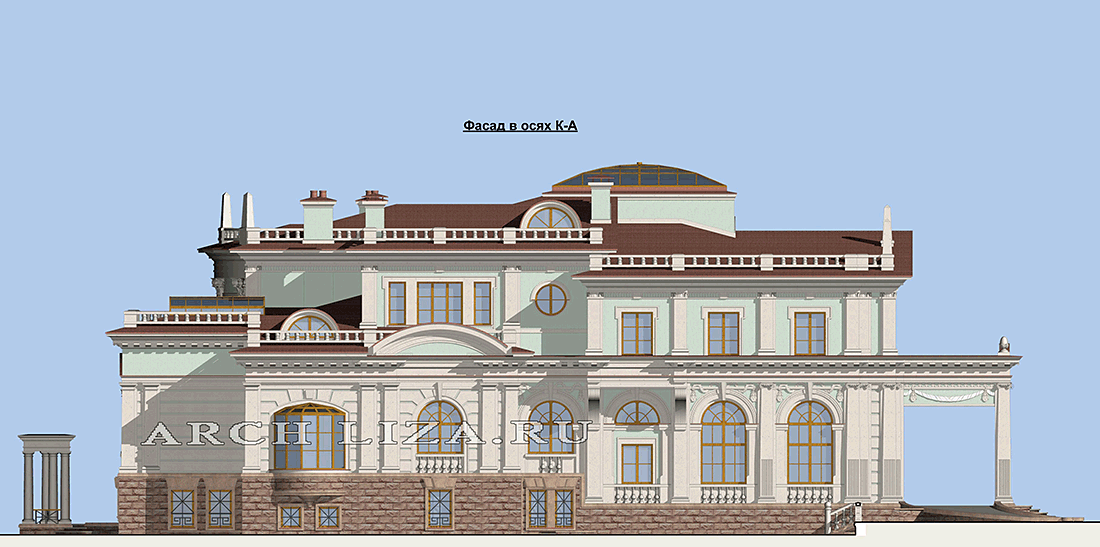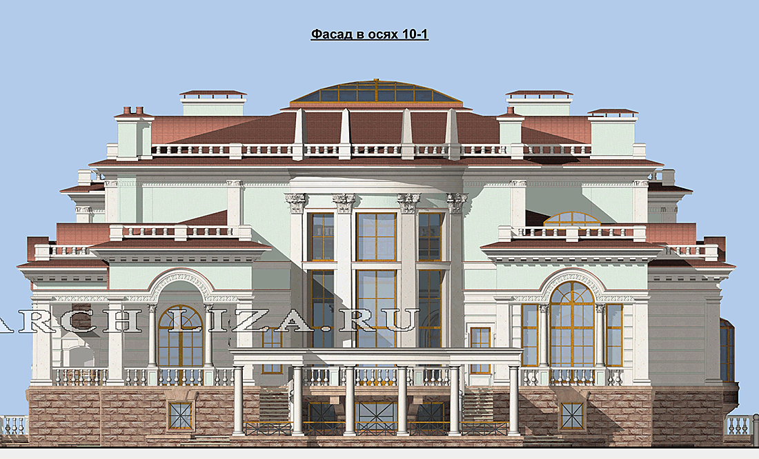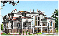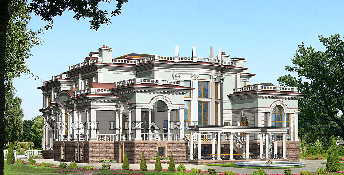 Наружная отделка -- цоколь: натуральный камень, 1 - 2 этажи: натуральный камень, декоративная фасадная плитка, декоративная штукатурка, мозаичная плитка