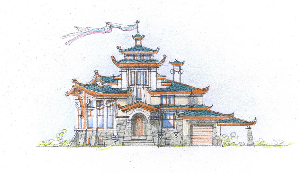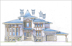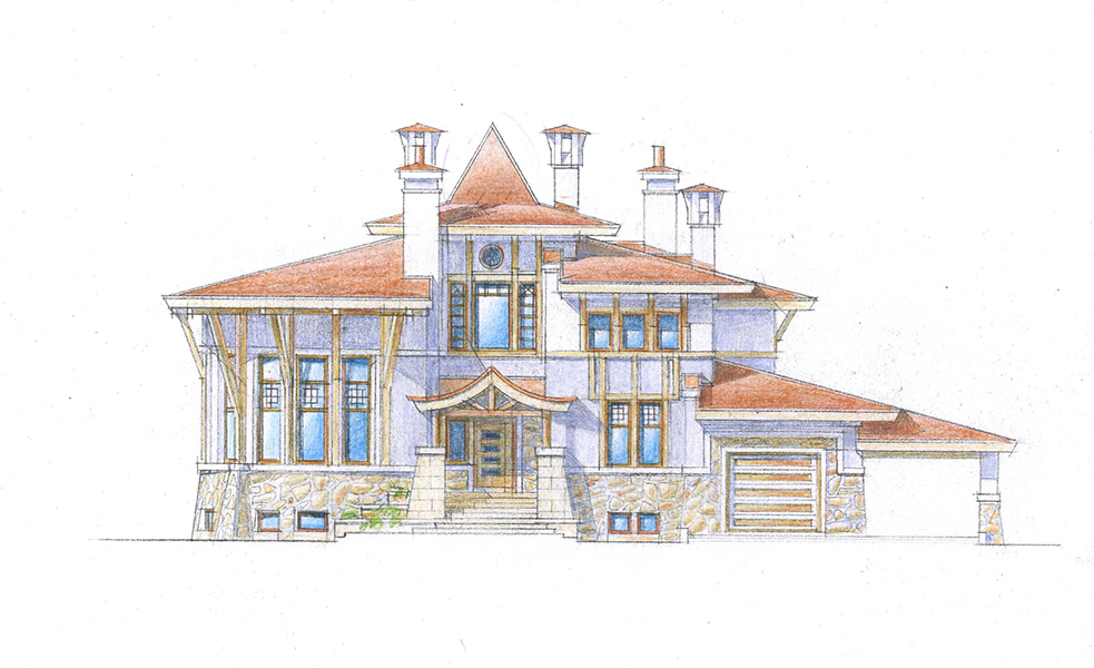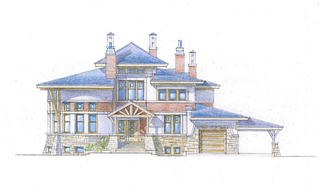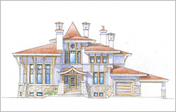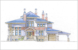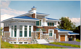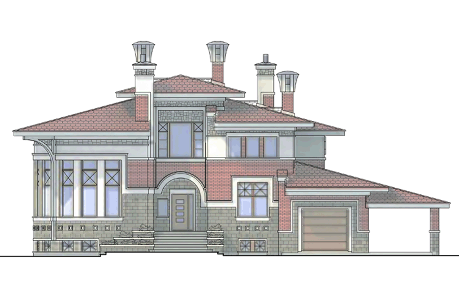 В объемно-планировочном решении дома и в стилистике фасадов использованы некоторые элементы раннего творчества известного американского архитектора Ф. Л. Райта. Компактный объем и строгая фасадная декорация позволяют использовать этот дом в плотной застройке коттеджных поселков. Тип фундамента - монолитная плита Материал наружных стен - кирпич с утеплителем Перекрытия - сборные Крыша - чердачная Покрытие кровли - мягкая или металлочерепица Наружная отделка стен - керамическая плитка, детали - штукатурка Цоколя - натуральный (искусственный) камень