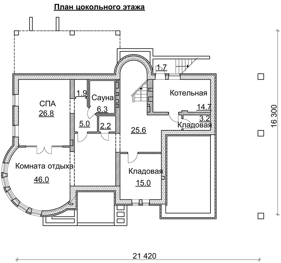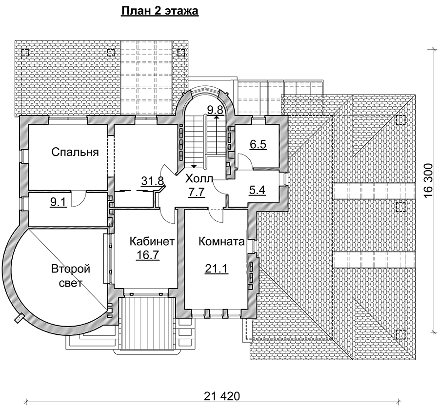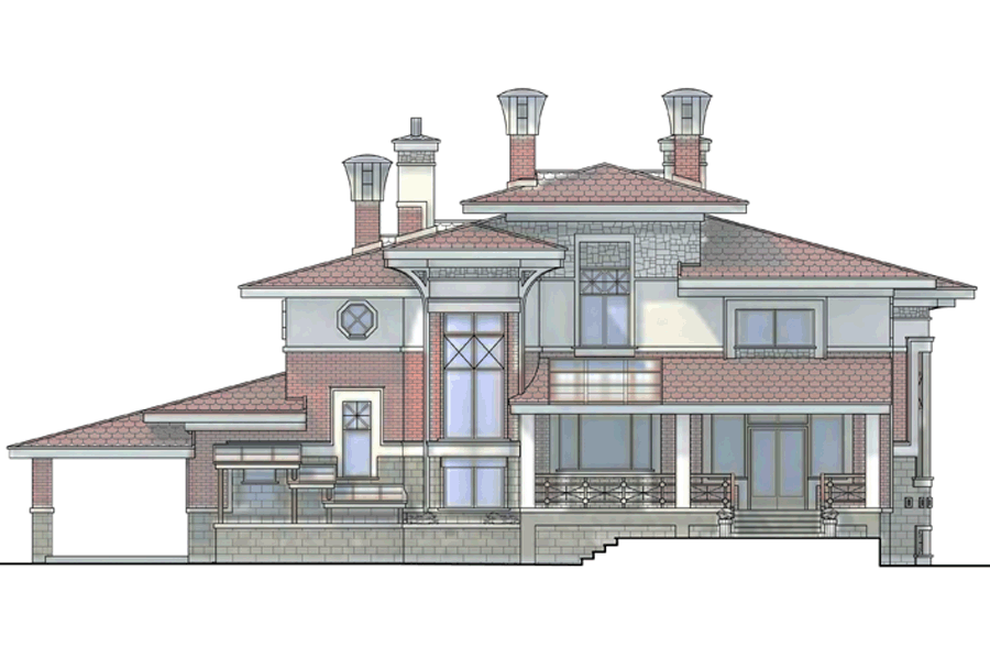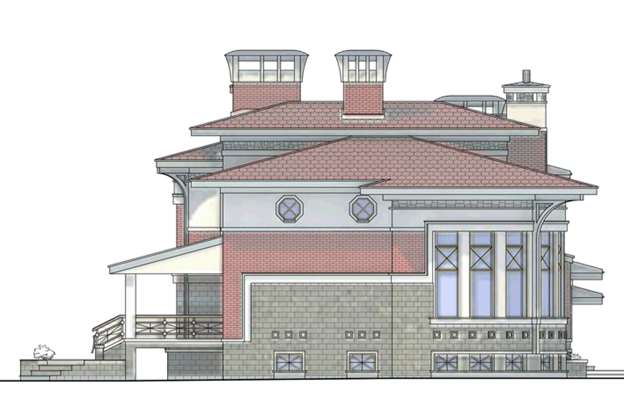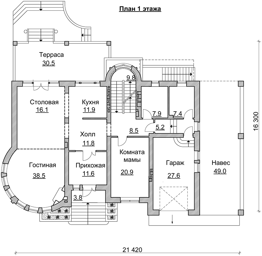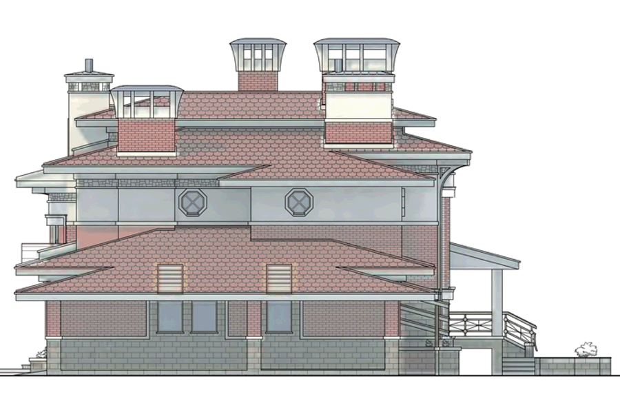 Площадь дома 539.9 м2 Общая площадь (приведённая) 464.3 м2 Площадь застройки 345.4 м2