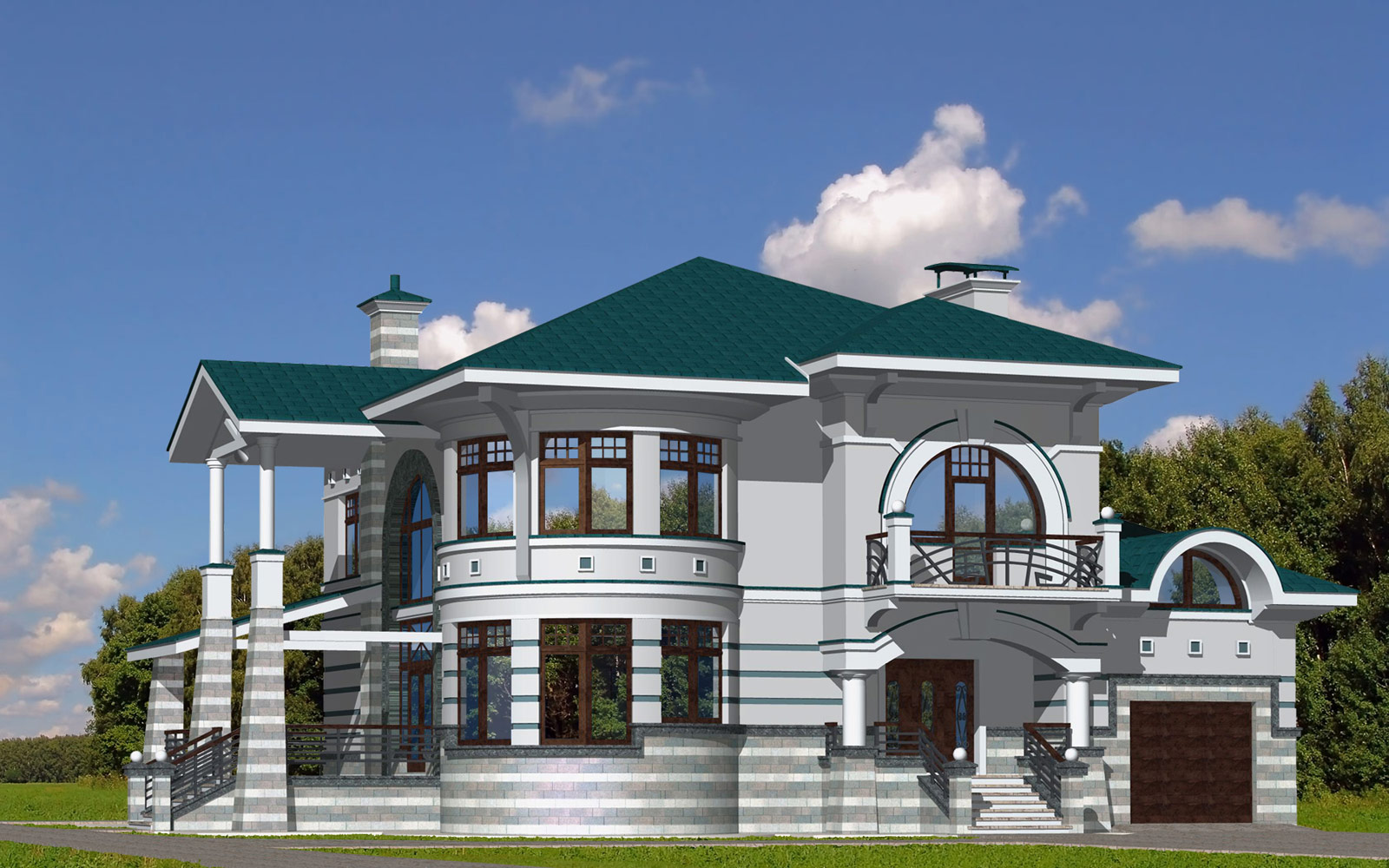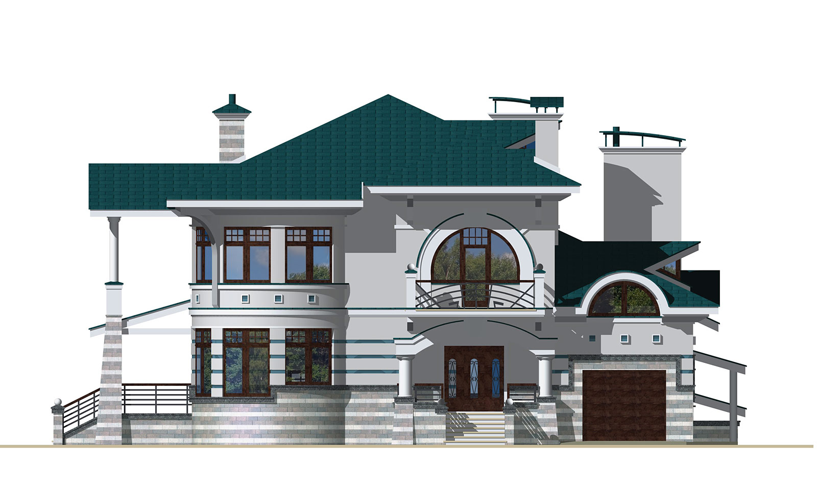 Двухэтажный пятикомнатный жилой дом спроектирован на участке со слабовыраженным рельефом.