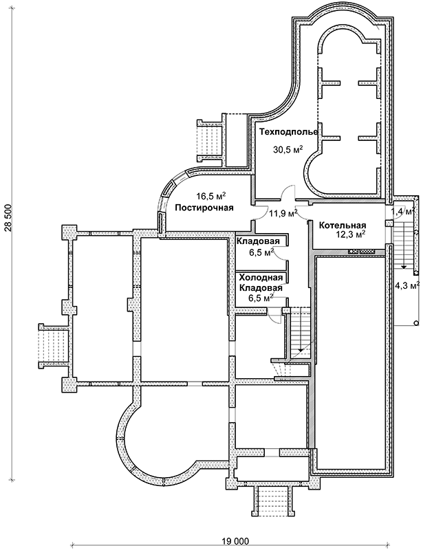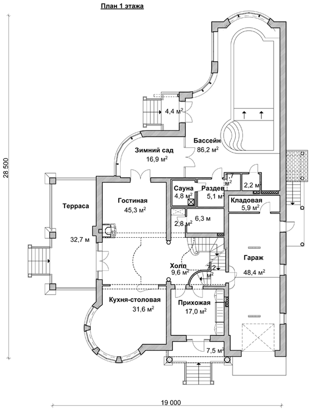На первом этаже расположены: просторная гостиная с двухсветной частью, раскрывающаяся в неё кухня-столовая с полукруглым угловым эркером, гостевая спальня и небольшой санузел с душем. Гостиная связана через зимний сад с бассейном.