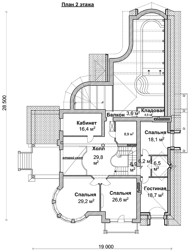 Второй этаж занимают три спальни с санузлами и гардеробной, а также размещенная на балконе, огибающем второй свет гостиной, библиотека. Спальня хозяев имеет выход на эксплуатируемую кровлю зимнего сада.