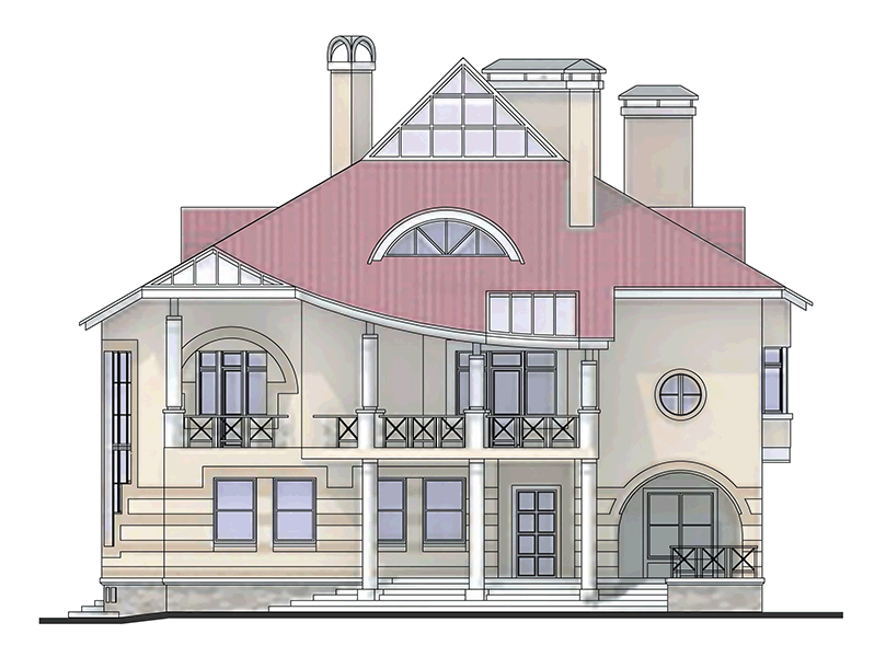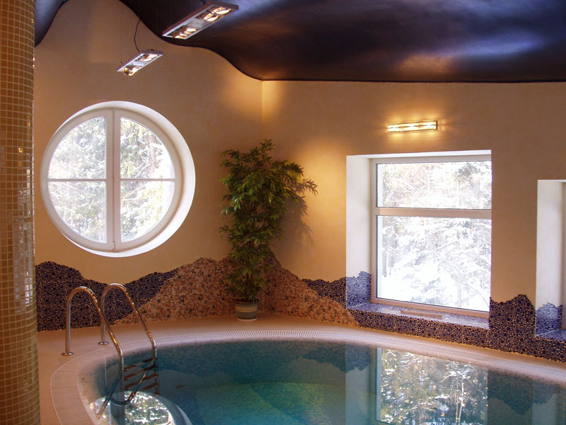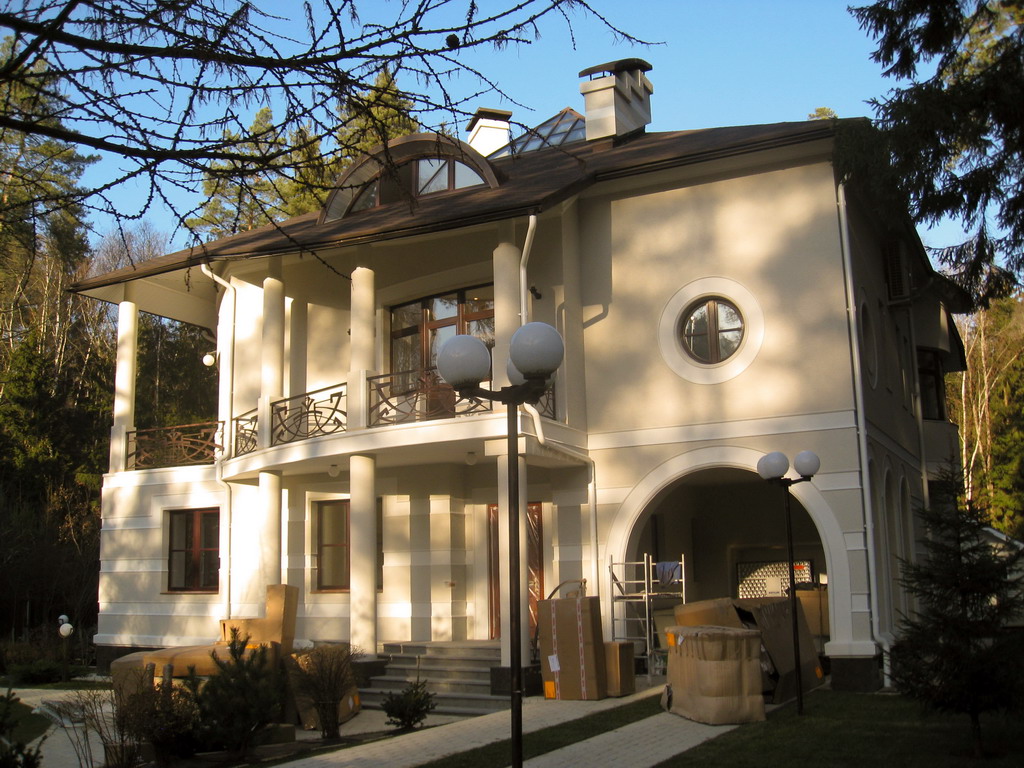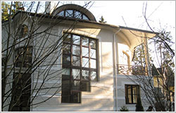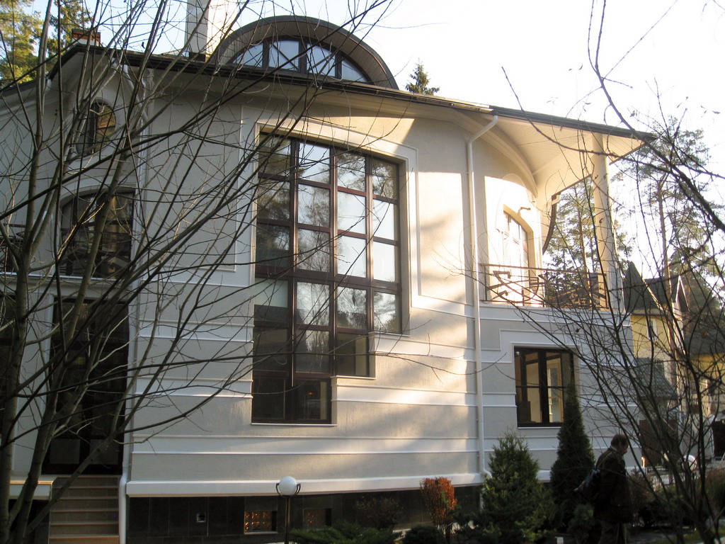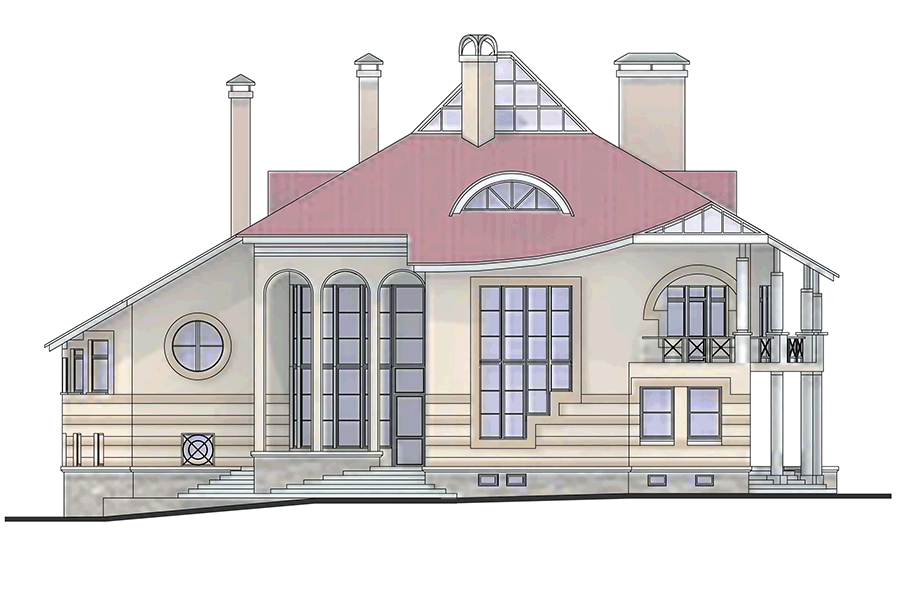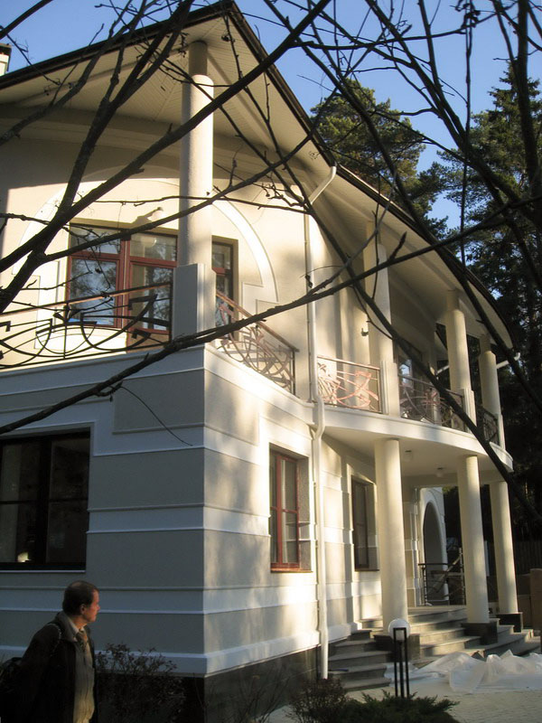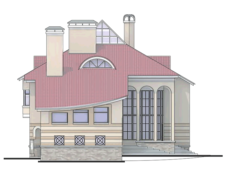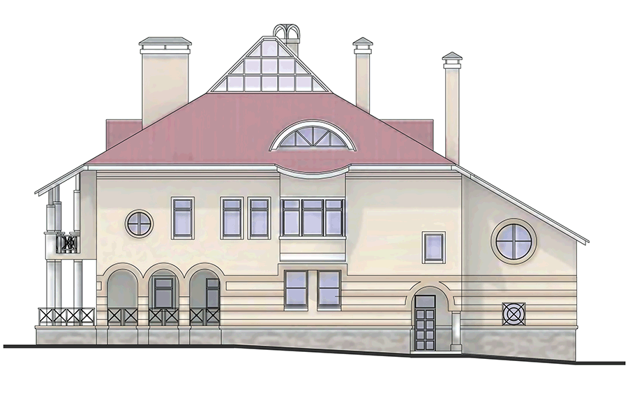6-комнатный жилой дом с гаражом, сауной и бассейном был спроектирован для участка, имеющего форму неправильного четырехугольника, сто обусловило своеобразную конфигурацию здания, нестандартное объемно-планировочное решение. Фундаменты - ленточные сборные Перекрытия - сборные с монолитными участками Стены - кирпичные с утеплителем толщиной 640мм. : Перемычки - сборные (монолитные) Кровля - чердачная, скатная, с деревянными стропилами Покрытие - мягкая-, металлочерепица Лестницы - монолитные ж.б. с облицовкой природным камнем.