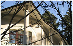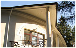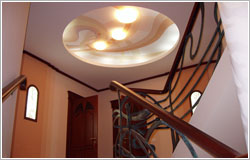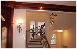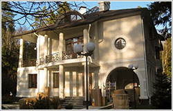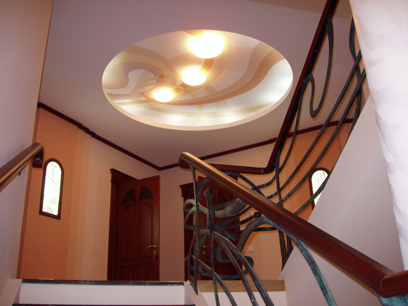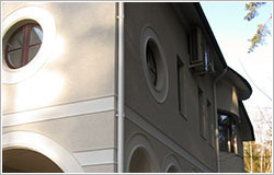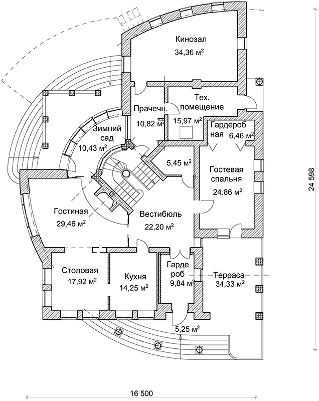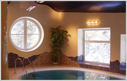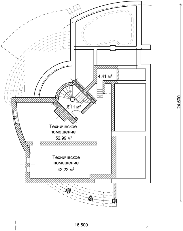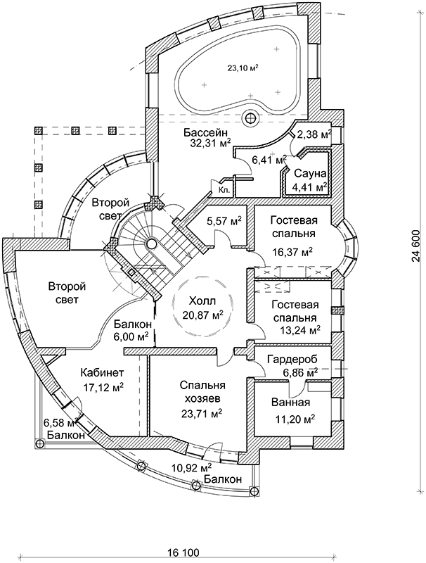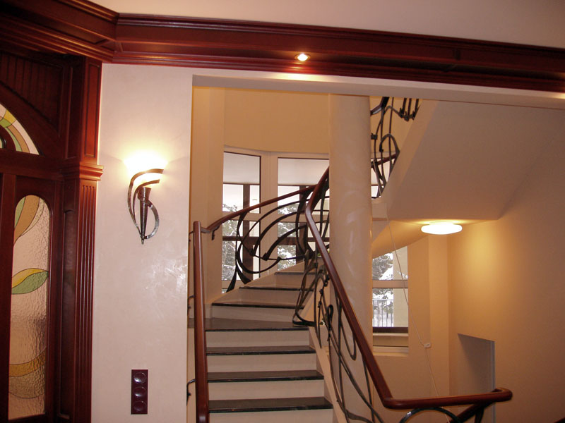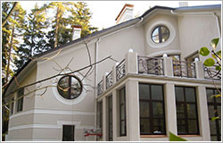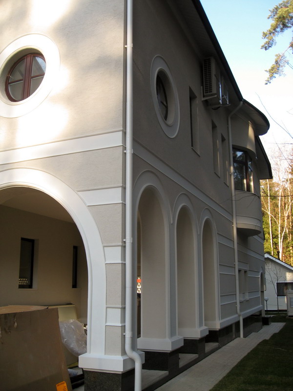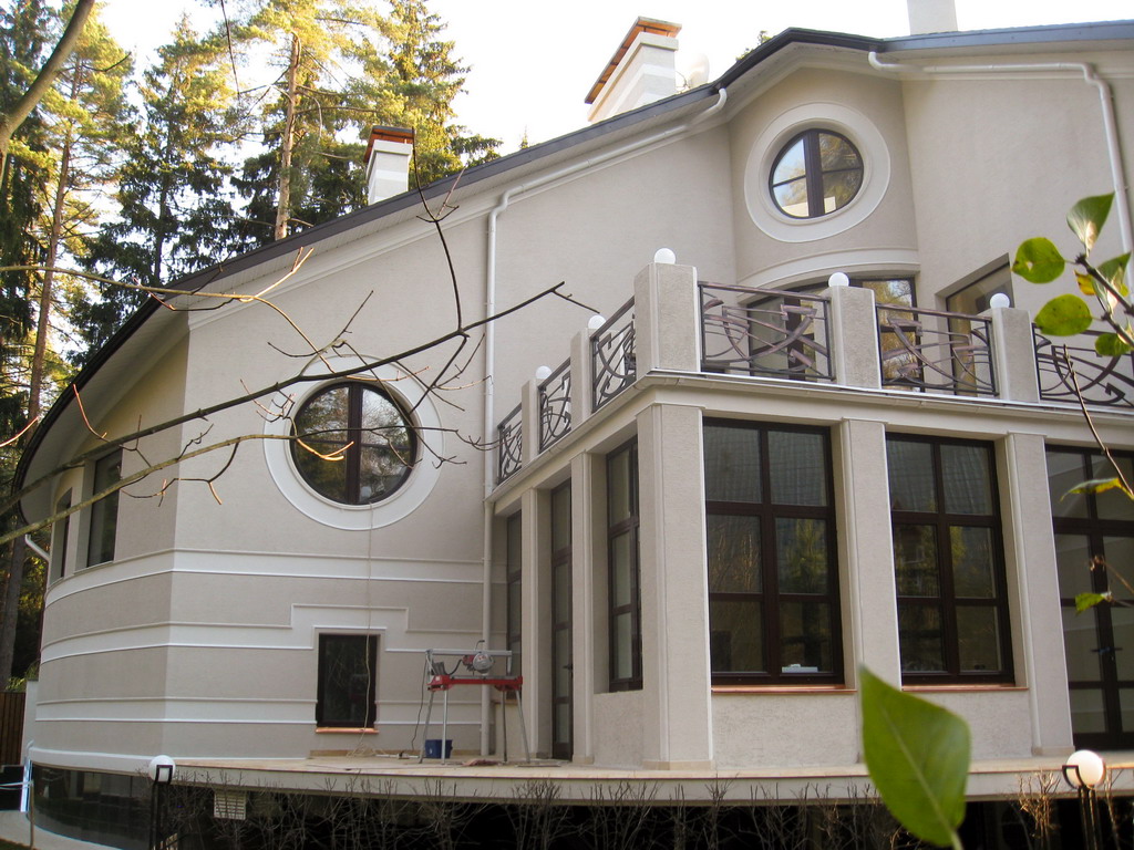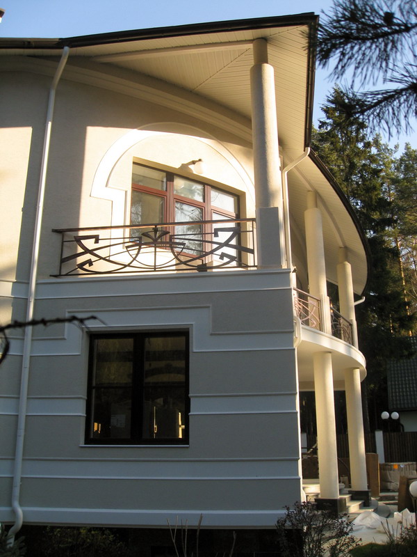 6-комнатный жилой дом с гаражом, сауной и бассейном был спроектирован для участка, имеющего форму неправильного четырехугольника, сто обусловило своеобразную конфигурацию здания, нестандартное объемно-планировочное решение. Фундаменты - ленточные сборные Перекрытия - сборные с монолитными участками Стены - кирпичные с утеплителем толщиной 640мм. : Перемычки - сборные (монолитные) Кровля - чердачная, скатная, с деревянными стропилами Покрытие - мягкая-, металлочерепица Лестницы - монолитные ж.б. с облицовкой природным камнем.