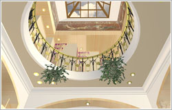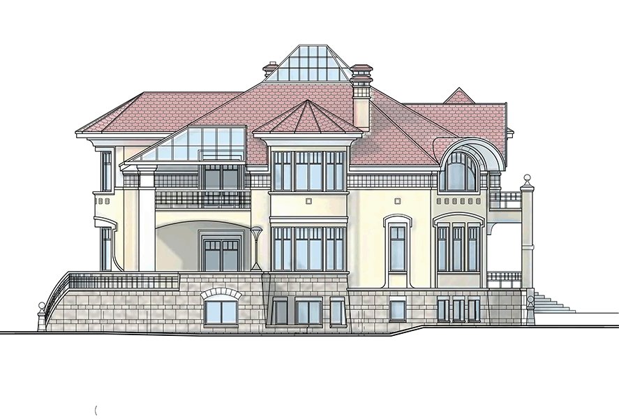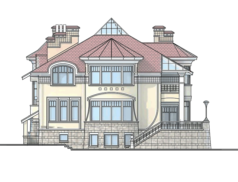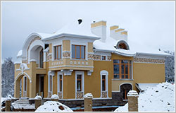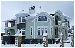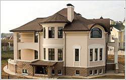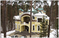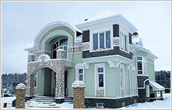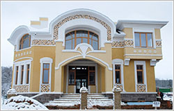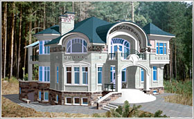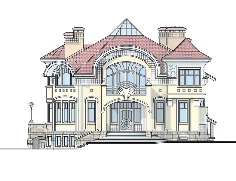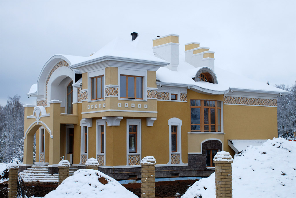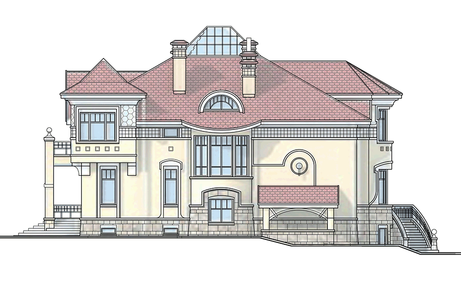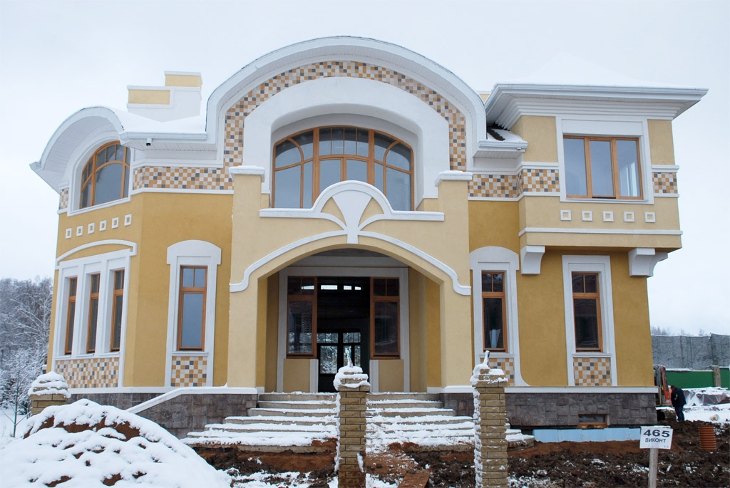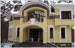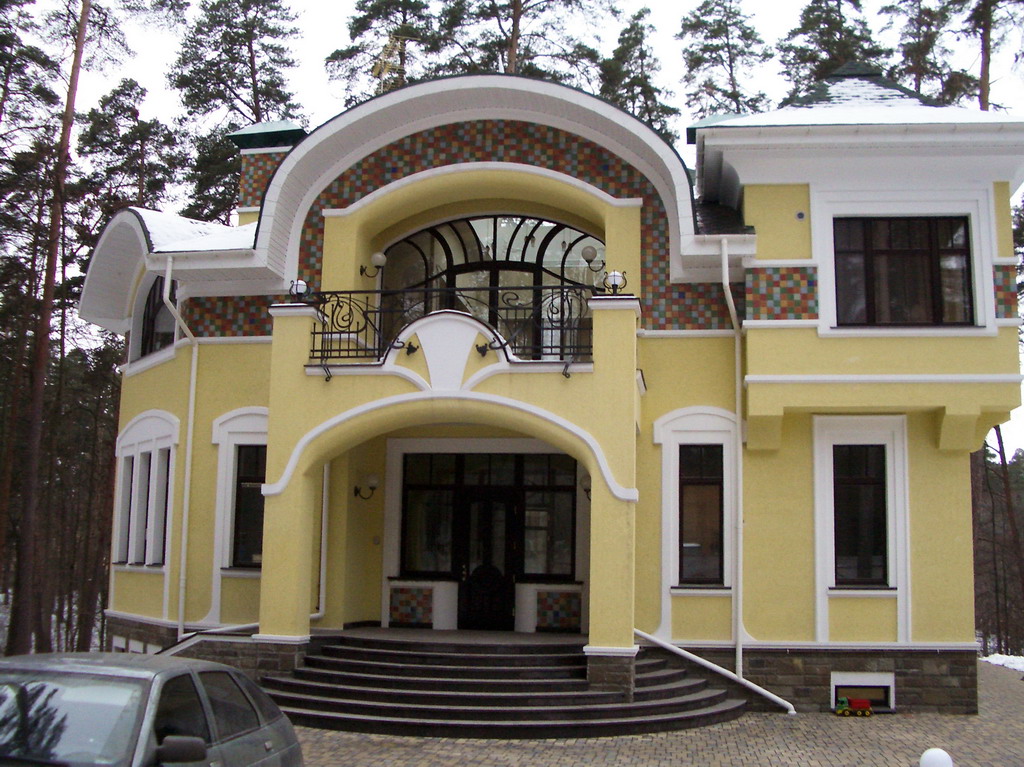 В стилистическом решении фасадов использованы мотивы русского модерна - архитектурного стиля модного в конце XIX - начале ХХ веков и получившего распространение в последние годы. Композиционным и коммуникационным центром дома является двухсветный холл с кольцевым балконом. На первом этаже помещения связаны между собой в единое пространство, что зрительно увеличивает его размеры и обогащает интерьер дома.