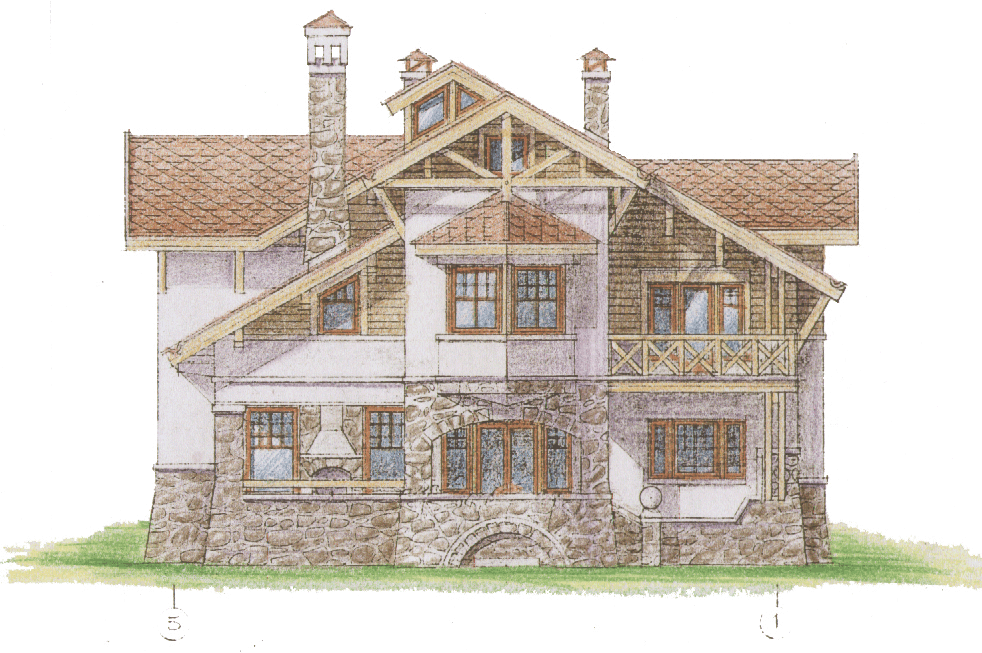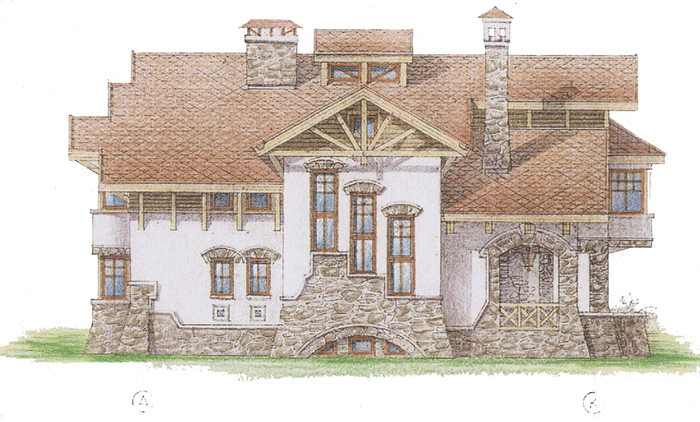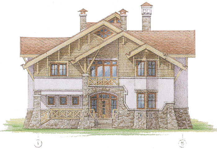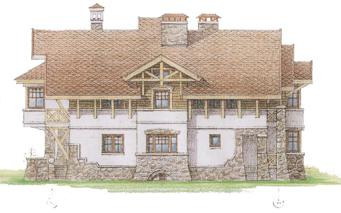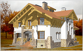 В архитектурном решении дома использованы мотивы индивидуальных жилых домов северной Европы. В отделке дова использованы: облицовка "Блокхаузом" (1/2 бревна), штукатурка и естественный камень в сочетании с деревянными ограждениями балконов и лобовыми досками, покрытыми слаботонированным лаком.