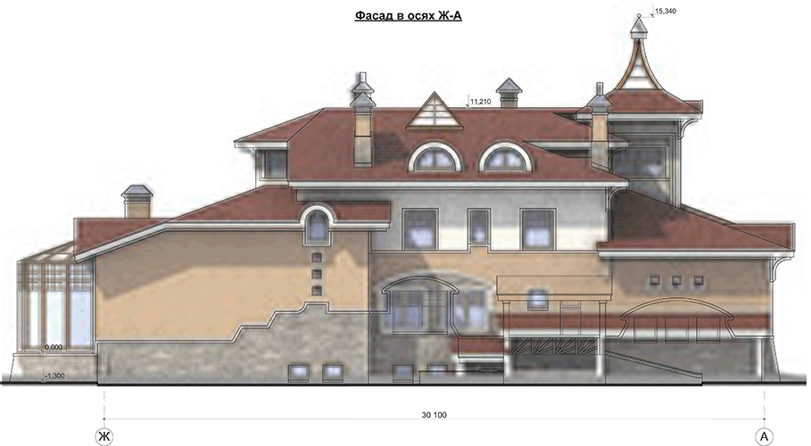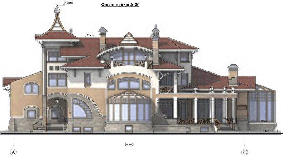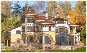 В стилистическом решении жилого дома использованы некоторые элементы, характерные для архитектуры Нормандии: облицовка первых этажей “рваным” камнем, деревянные кронштейны, башенки над входами. Развитие пространства дома происходит от входной части в глубину участка. На первом этаже находятся вестибюль, гостиная, холл, также столовая с выходами на крытую террасу и бассейн. Слева к входной группе примыкает гараж, связанный с хозяйственной частью. На втором этаже размещены: спальня хозяев, три детских, гостевая комната и спальня няни. В мансарде расположены два кабинета, детская комната и кладовая.