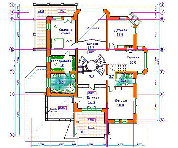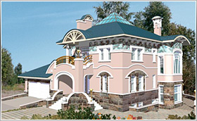 Центром композиции дома и его вертикальной осью является круглая в плане лестница. Во внешней отделке дома прослеживаются характерные черты «модерна» - декоративный пояс из керамической плитки, пластичные линии карнизов, обрамления окон. Тип фундамента – ленточные сборно-монолитные Материал наружных стен – кирпич с утеплителем 640 мм толщиной Перекрытия – сборные Крыша – чердачная Покрытие кровли – мягкая или металлочерепица Наружная отделка стен – цветная штукатурка, фасадная плитка, детали – штукатурка белого цвета Цоколя – натуральный (искусственный) камень