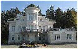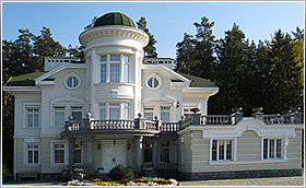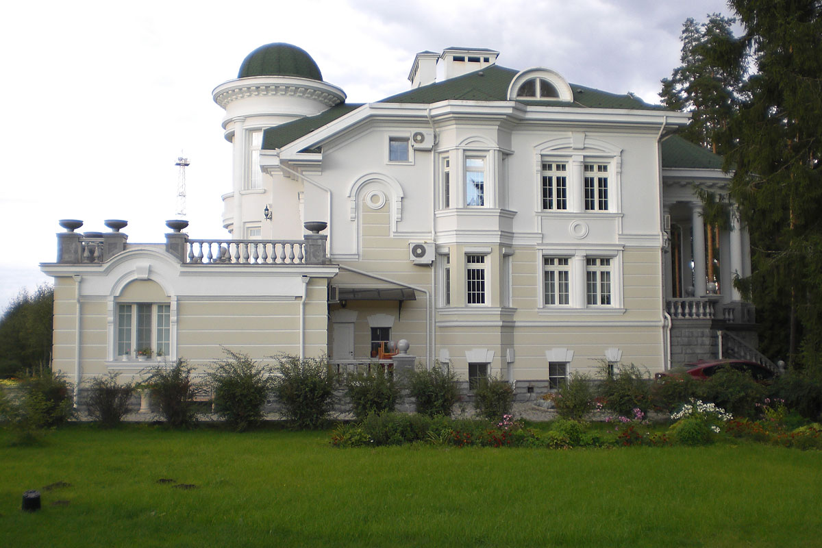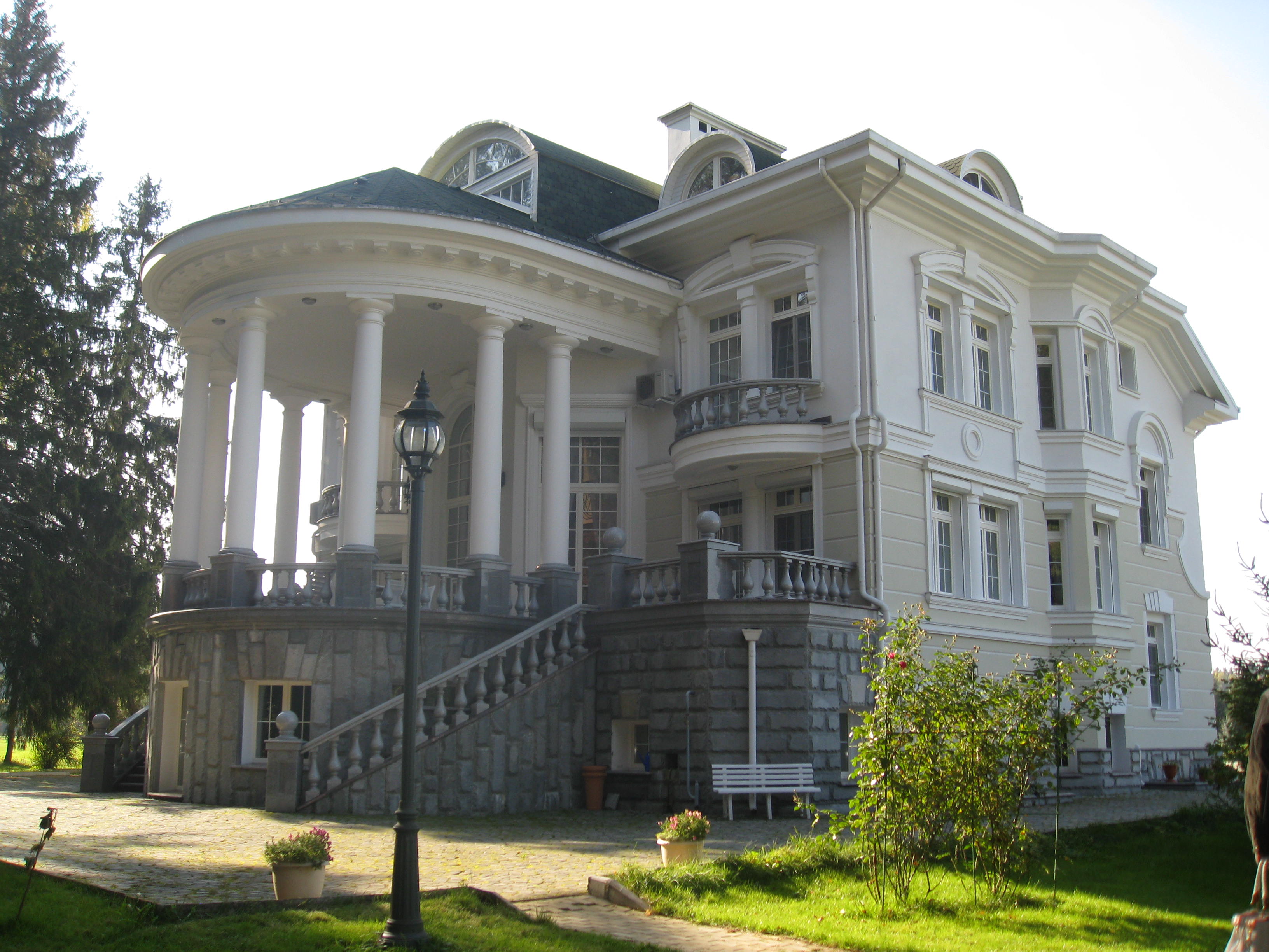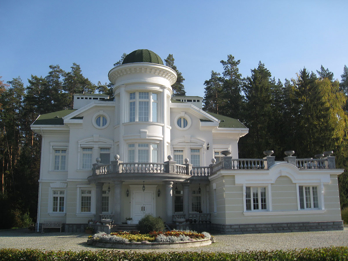 Наружная отделка – цоколь: естественный \ искусственный \ «дикий» камень, 1 этаж: естественный \ искусственный \пиленый камень, 2 этаж: цветная штукатурка, архитектурные детали белого камня.