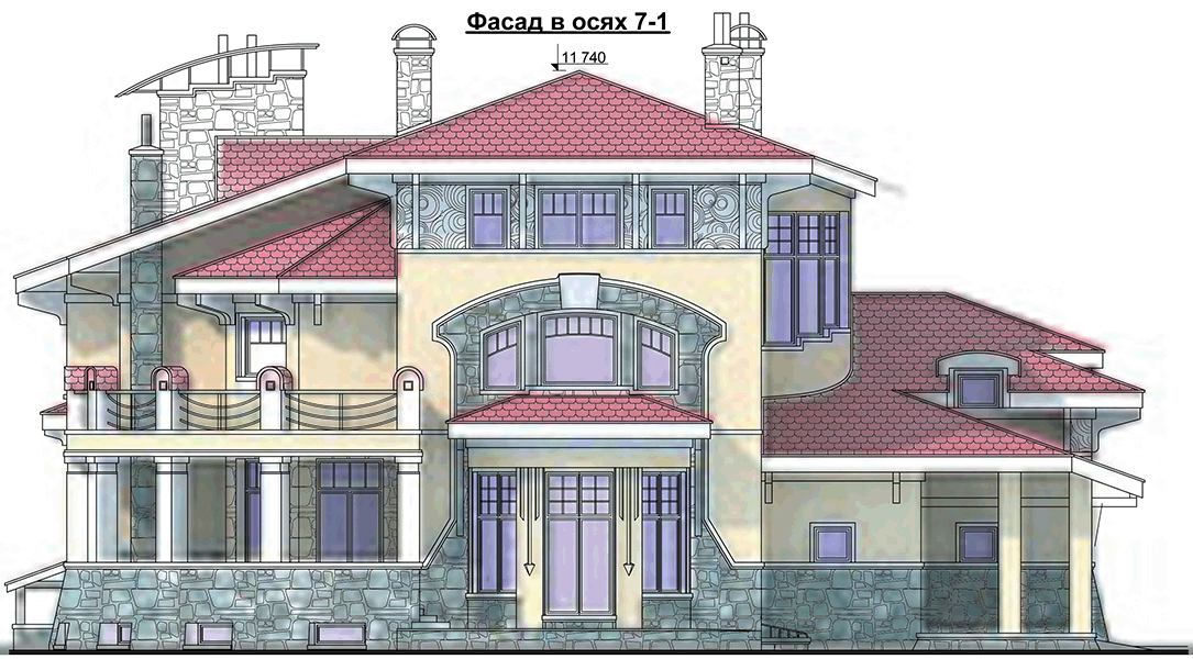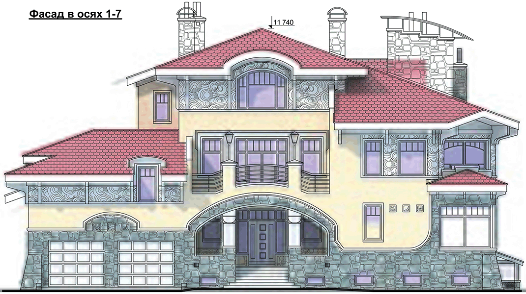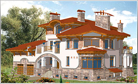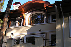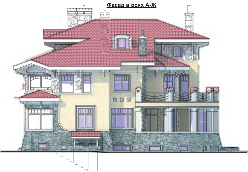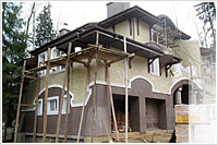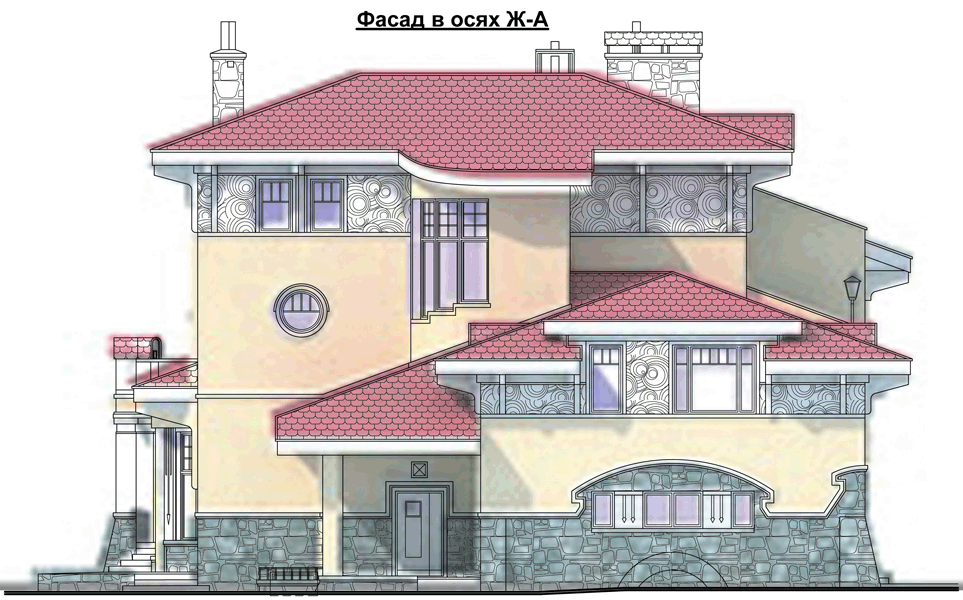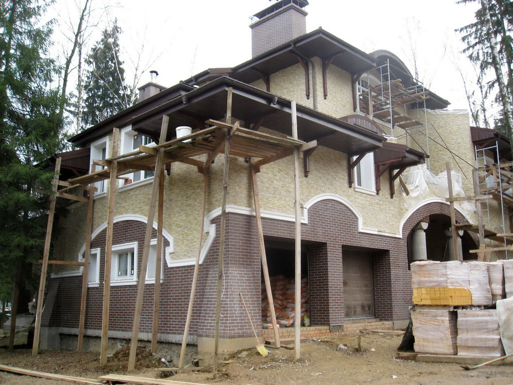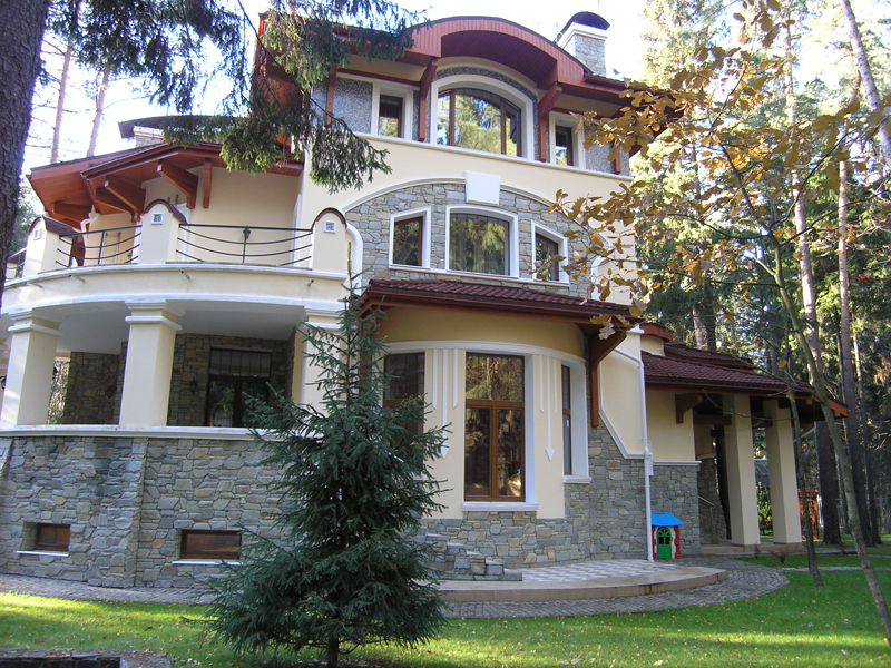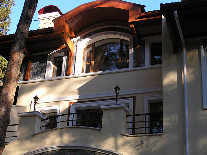 Наружная отделка стен - цветная фасадная штукатурка, детали - белая штукатурка, керамическая фасадная плитка