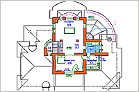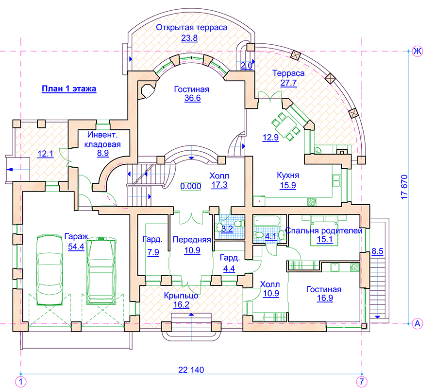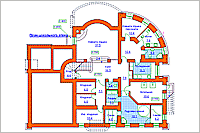 Композиционное решение дома представляет собой единый центрический объем с многоуровневым внутренним пространством. Фасады не деляться на главные и второстепенные. Они относительно равнозначны, ассиметричны, но имеют осевую композицию.